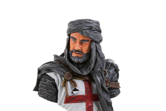 A 1:10 scale painted bust of a Templar Knight from the days of Jerusalem. Also known as 'Knights of Christ', mounted on a wooden plinth with a white metal base frame and button feet, figure H13.5cm
