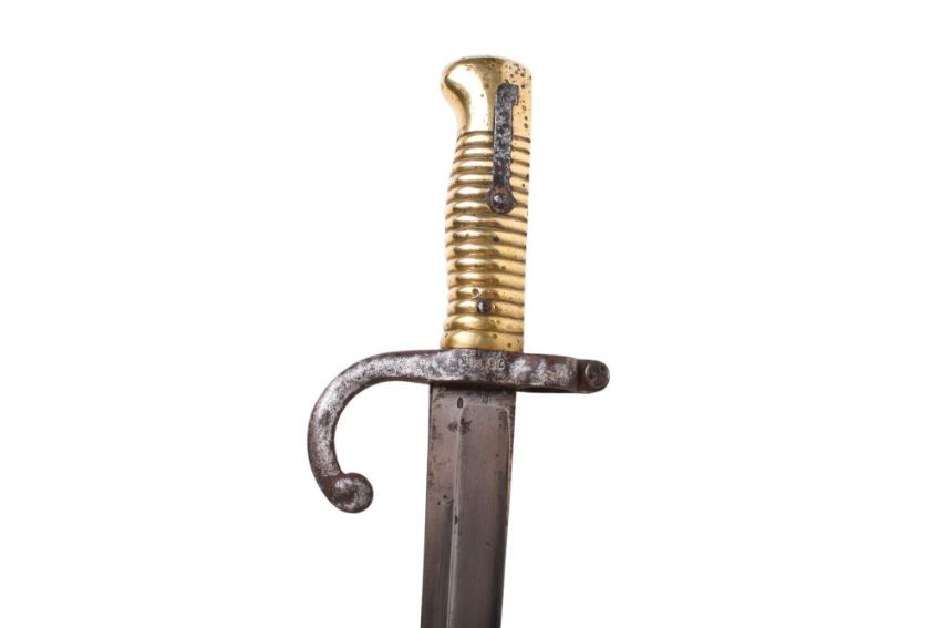 A late 19th century French yataghan chassepot bayonet. With ribbed brass grip, quillon marked 78913 and D49124 as well as crownC, crownM and K*. Ricasso marked crownC and *K, and engraved 'Mre.Impale. de Mutzig 10bre 1867' to side of blade. Blade L57.5cm, in unmarked metal scabbard. Please note, we are unable to provide postage service for this lot.