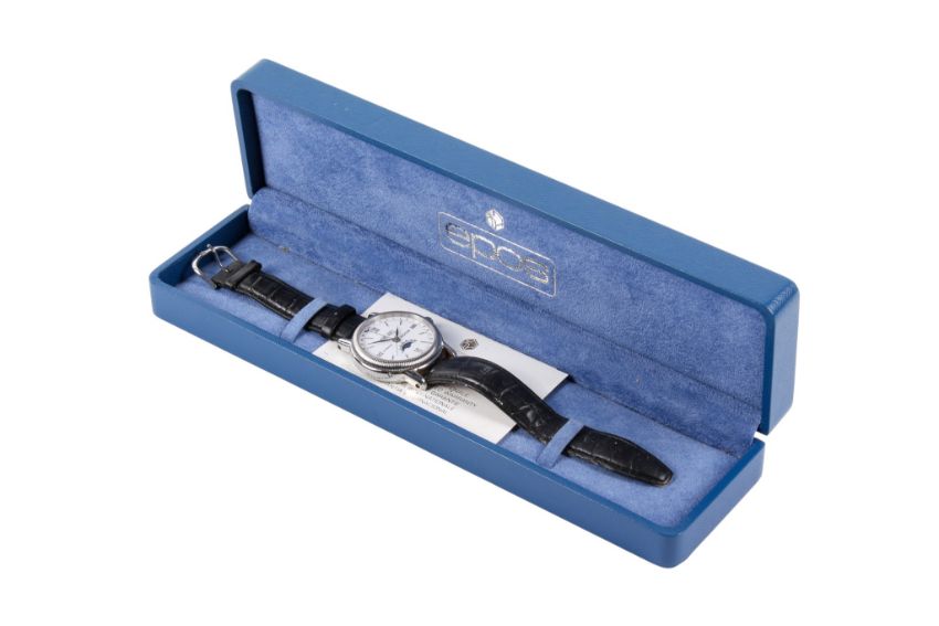 Epos Emotion 'moon phase' stainless steel wristwatch, boxed. White dial, Roman numerals and batons, day/date/moon aperture, no. 3191 with black leather strap, circa 2001, case diameter 37mm