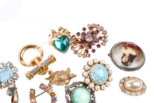Twenty vintage costume jewellery brooches. Including a bar brooch modelled as a riding crop, an Asian brooch decorated with an architectural scene, a malachite brooch modelled as leaves and more