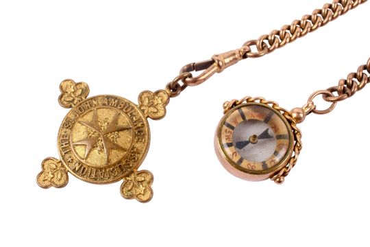 A Victorian 9ct gold cased compass and Albert chain. Hallmarked to compass case, each link and t-bar, gross weight 41.2g and chain length 41cm, with an attached St John's Ambulance pendant awarded to '284392 Leonard J Young'.