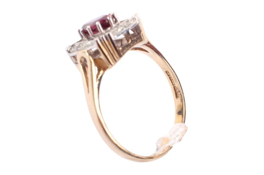 A 9ct gold, diamond and garnet dress ring. Of rectangular form, set with an oval cut garnet of circa 7mm x 4mm and small diamonds, hallmarked, size R, gross weight 3.8g.