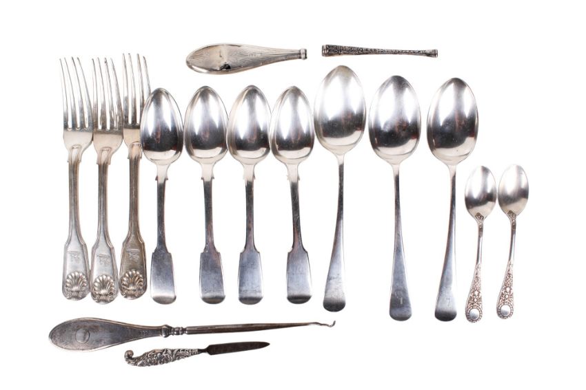 A collection of Georgian and Victorian silver cutlery. Comprising three Georgian forks by William Eaton, London 1836, weight 237.4g; four Victorian spoons by William Eaton, London 1844, weight 220g; two Victorian teaspoons, Sheffield 1869, weight 46.4g; three spoons, Sheffield, 1926, weight 157.9g; a silver boot hook handle, weight 15.4g; a silver handled boot hook and a silver handled file. Gross weighable silver 673.5g.