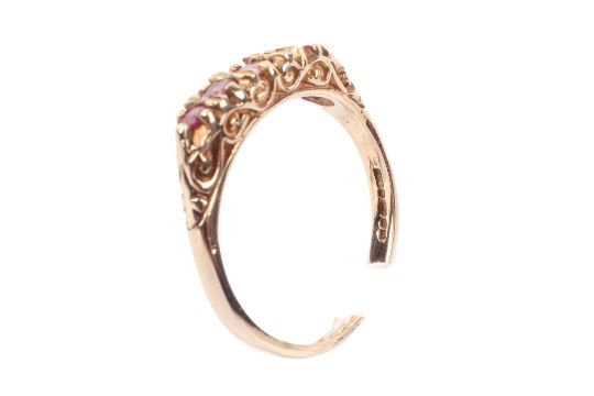 A 9ct gold and ruby ring. With five small graduated stones, hallmarked, size O1/2, gross weight 2.7g.