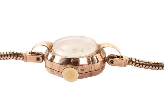 A 9ct gold lady's Marvin wristwatch. The dial with gilt Arabic numerals, the case of slight quatrefoil form, hallmarked '375', circa 1.2cm x 1.2cm, on a narrow snake chain bracelet, clasp hallmarked. Gross weight 11.8g.
