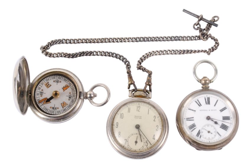 Two vintage pocket watches and a WWI military compass. One pocket watch with 0.800 mark to inside back case, case diameter 4.8cm, the second pocket watch marked 'Westclox Pocket Ben' to the face, and with a hallmarked silver double Albert chain, circa L40cm, the compass with military arrow and marked 'Terrasse W. Co., VI, 91031, 1918'.