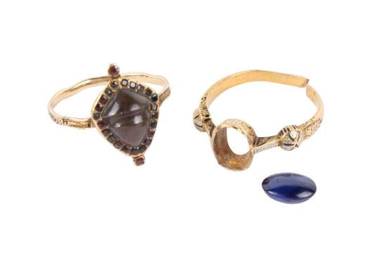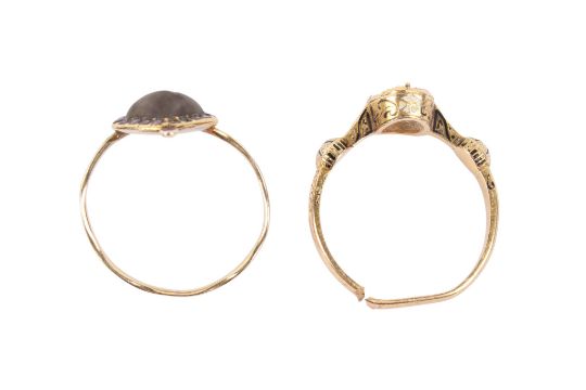 Two Georgian mourning rings. The first set with a green hardstone, possibly of scarab form, surrounded by garnets, in a yellow metal mount, the outer shank engraved 'D... GIBBS OB...1768... 17... ', size circa O; the second of yellow metal with remains of blue and white enamel decoration, traces of engraving to the inside shank, shank broken, with a loose blue cabochon. Gross weight 5g.