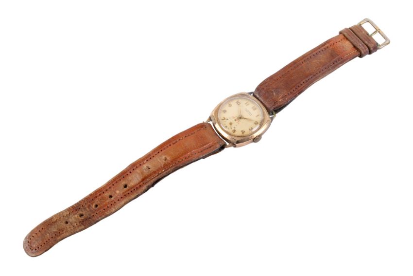 A vintage 9ct gold EJ Frankland of Ludgate Circus gentleman's wristwatch. Gilt Arabic numerals and secondary dial to the cream face, hallmarks to side of case and full hallmarks to inside back case, case diameter 2.9cm, on a brown leather strap.