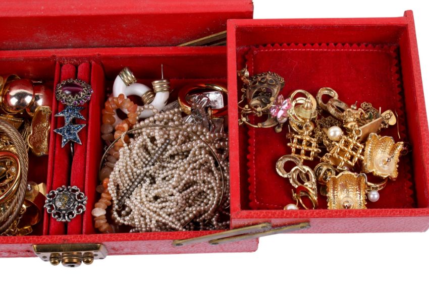A red jewellery box containing an assortment of costume jewellery. Including pairs of gilt metal earrings, a pearl necklace, white metal and chrome earrings and more