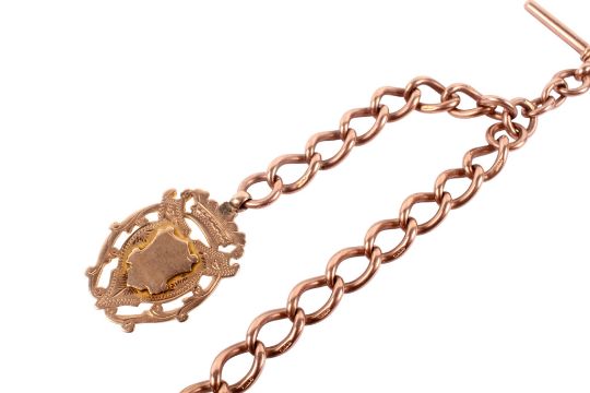 A 9ct gold Albert watch and pendant. Each link and the shield pendant hallmarked, length of chain 39cm, gross weight 45.2g.