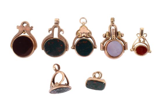 Seven Georgian and later 9ct gold and stone fobs. Set with carnelian, bloodstones, agate, etc, one with intaglio engraving of Hermes and a chariot within zodiak figures, another with a bird cage and motto, two hallmarked, all tested as 9ct gold, gross weight 31.1g.