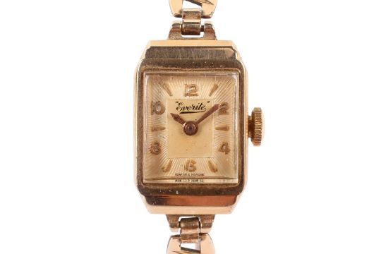A 9ct gold cased lady's Everite wristwatch. The rectangular dial having gilt Arabic numerals and baton hour markers, case side and inside back case hallmarked, on a rolled gold bracelet strap.
