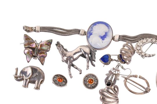 An assortment of silver and white metal jewellery. Comprising an engraved silver bangle, 22.3g, a white metal bracelet decorated with a blue and white oval cameo of a young girl, stamped '925', five brooches including one modelled as a horse, 44.9g gross, and four pairs of earrings