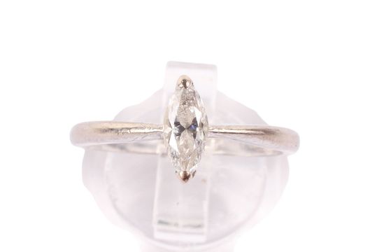 A white metal diamond solitaire ring. The faceted stone of marquise form, 7mm x 3mm, circa 2.3ct weight, in an unmarked white metal setting, size M1/2, gross weight 2.5g.