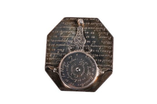 A circa 1700 French silver 'Butterfield Dial' pocket sundial and compass. Signed 'Butterfield, A Paris', with engraved bird-pointer folding gnomon, compass base marked 'Premier Cadran' (First dial), Paris discharge mark for smallwork to the back corner, compass glass diameter 3cm, total 6.4cm x 5.8cm, gross weight 35.9g.Michael Butterfield (1635-1724) was a British clockmaker who worked in Paris in the late 17th and early 18th century. He was primarily known for producing sundials for use by Grand Tour travellers, enabling them to determine the time in the towns they visited.