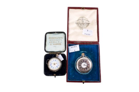 Two white metal cased watches and a silver medal. Comprising a half hunter watch with a manual wind movement, the white enamel dial with Roman numerals, case marked '0.935', 48.0g gross and a fob watch, the white enamel dial with blue Roman numerals and gilt details, the heavily engraved case marked '0.935', 32.2g gross. The boxed medal stamped 'Presented by Ryder & Son Seed Merchants, St Albans', maker Vaughton & Sons, Birmingham 1912, in a white metal mount, 17.4g gross