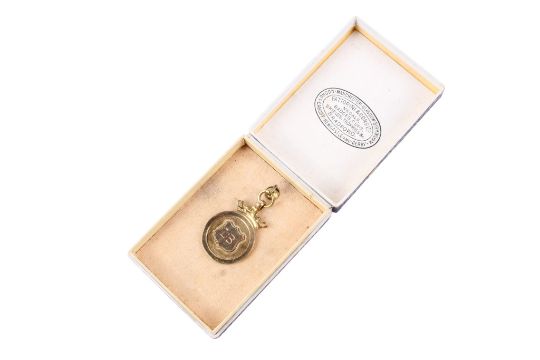 A 9ct gold medal, awarded to the Somerset Junior Cup Winners, 1926-7. The round pendant topped with a crown, with central shield to the centre engraved 'LB'. Total height including loop 3.2cm, weight 5.3g.