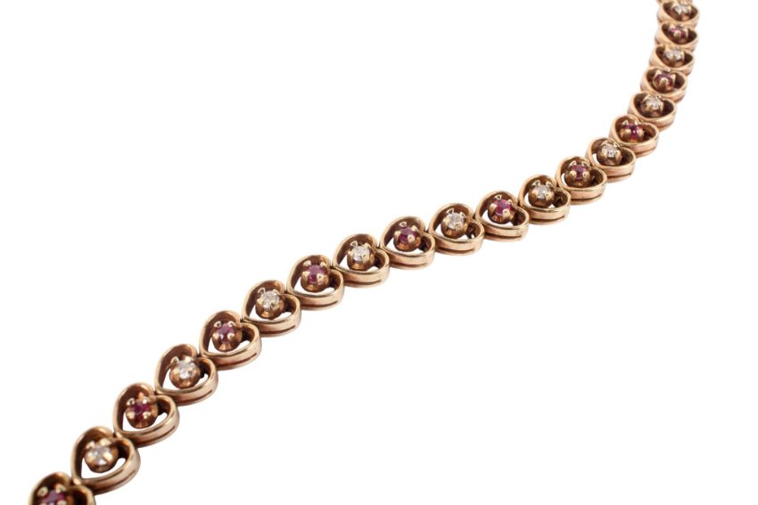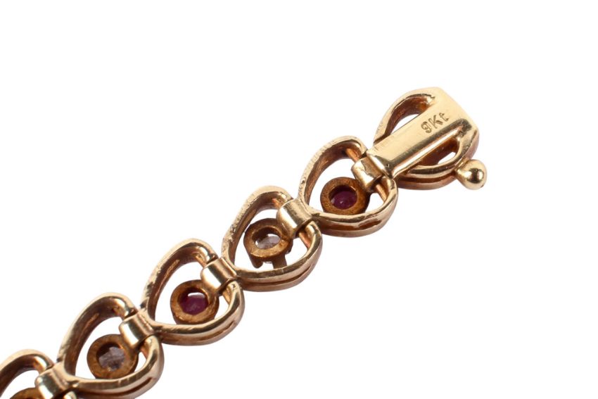 A 9ct gold bracelet. The heart shaped links set with alternating round cut red and white stones, marked '9ct' and tested as such, L18cm, gross weight 14.1g.