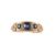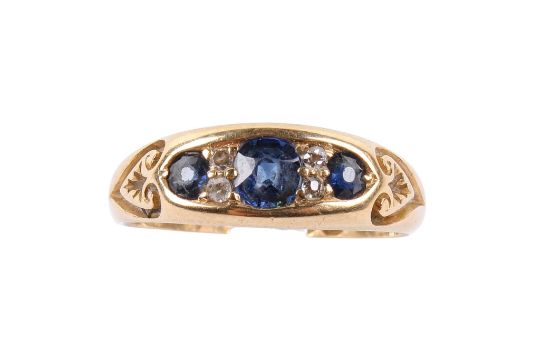 An 18ct gold and sapphire ring. Set with three sapphires and four small diamonds, hallmarked to shank, size N, gross weight 3.6.