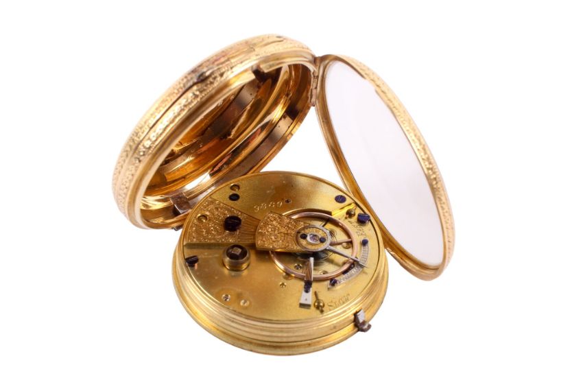 A late 19th century 18ct pocket watch. The face with black Arabic numerals centred with an engraved flower pattern, the case decorated with flowers and scrolls, inside back case and dust cover hallmarked 18ct. Case diameter 4cm. Gross weight 56.9g.