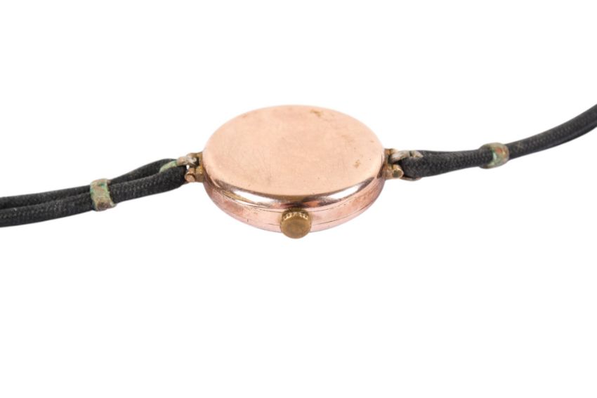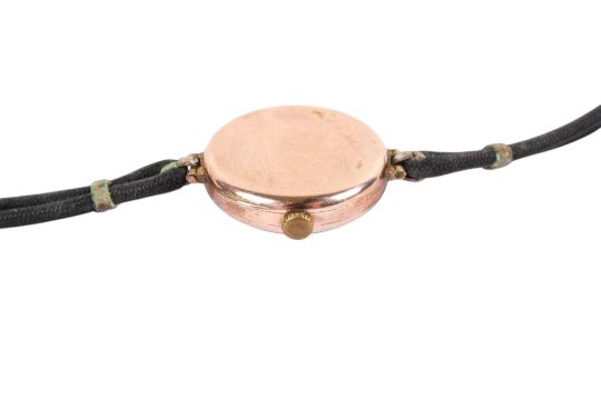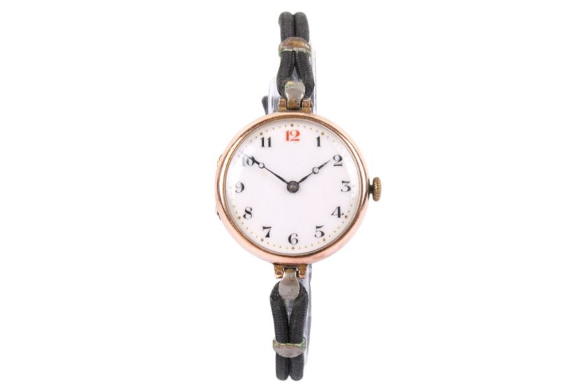 A 9ct gold cased wristwatch. The white enamel face with black and red Arabic numerals, hallmarks to front case, inside back case and inside dust cover, diameter of case 2.5cm.