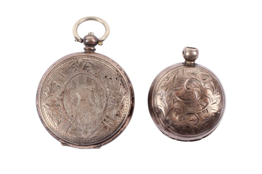 A French 800 silver cased pocket watch and an English silver sovereign case. The first with black Roman numerals and central flower decoration above a subsidiary dial, hallmarks to inside back case, diameter 3.8cm, the second with engraved floral decoration, hallmarks to inside back case and outer frame of spring case, diameter 3cm, gross weight 58.2g.