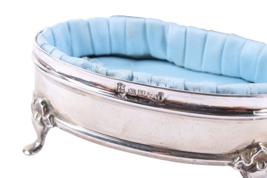 An Edwardian silver trinket box. Marked James Deakin & Sons (John & William F Deakin), Chester 1907, of oval form with scrolling feet and a blue silk lining, width 9.5cm