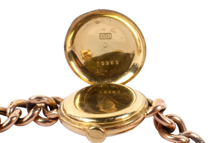 An 18ct gold lady's watch. The white enamel dial with blue and red Arabic numerals and gilt markers, inside back case and dust cover with Swiss 18k mark, case diameter 2.7cm, on an gold link bracelet, some links marked '18ct', broken clasp marked '15ct' but tests circa 14ct. Gross weight 37.5g.