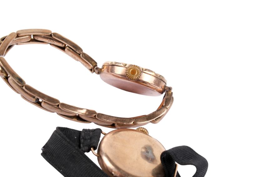 Two ladies' vintage 9ct gold cased wristwatches. Comprising one with a silvered dial and Arabic numerals, the rose gold case hallmarked, attached to a strap marked '9ct', weight 17.7g gross, and a watch with a silver and gilt dial and Roman numerals, the rose gold case hallmarked, attached to a black fabric strap