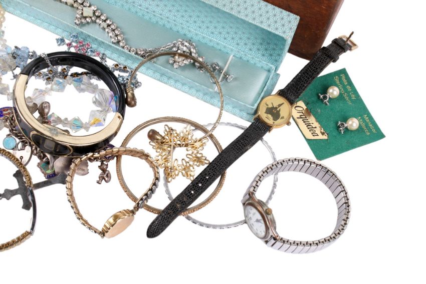 A collection of watches and costume jewellery. Including a white metal filigree bracelet decorated with engraved panels, weight 17.7g, a gold plated bangle, a turquoise and seed pearl brooch, a white metal charm bracelet with numerous enamel, silver and white metal charms, weight 29.5g gross, a ladies 9ct gold cased Everit watch and more