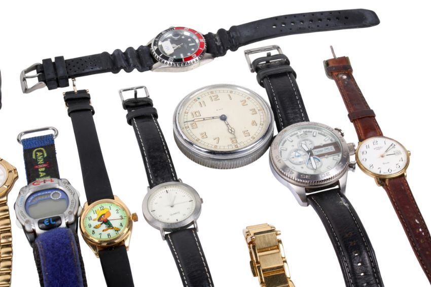 A collection of gentlemen's watches. Including a Nautica Chronograph watch, model A11015, black dial, Arabic numerals and a black leather strap, a Rotary watch with a quartz movement, white dial with Arabic numerals and a brown leather strap, Rotary tank style watch with Roman numerals, a gold plated case, a Krug-Baumen watch, quartz movement, a white dial with gilt Roman numerals, in a gilt metal case and strap, and more