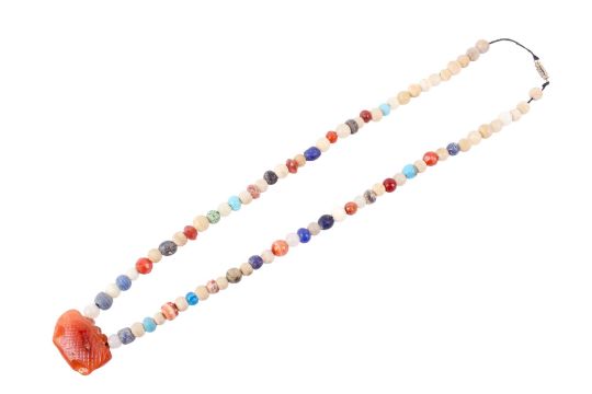 A string of Roman beads with an amygdaloid carnelian pendant, possibly Minoan. The small beads of glass and stone, the pendant with ribbed upper edge, the whole with crosshatched decoration, circa 2.4cm x 3.6cm x 1cm.