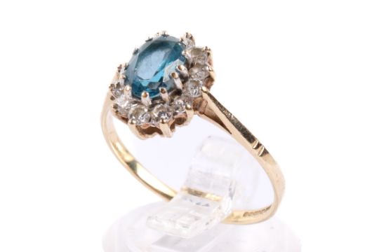 A 9ct gold and topaz cluster ring. The central faceted topaz circa 6mm x 4mm, surrounded by small cubic zirconias, hallmarked, size P1/2, gross weight 2g.