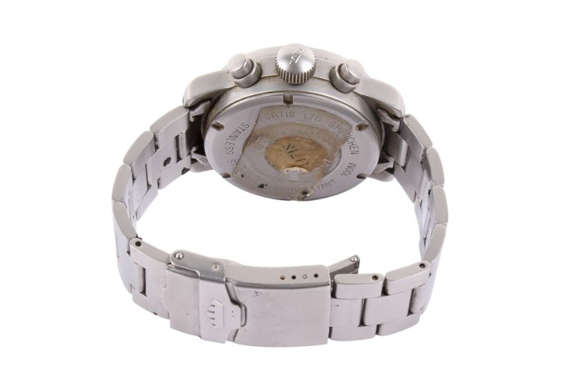 Fortis Fleiger Chronograph 'pilots' stainless steel wristwatch. Black dial, Arabic numerals, day/date aperture, three subsidiary dials, 597.22.141.2, 39mm, with box.
