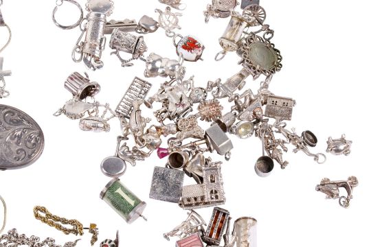 A collection of silver and white metal jewellery, spoons, charms and a watch. Including bracelets, necklaces, earrings, pendants, etc, some hallmarked, gross weight silver circa 190g, together with a quantity of assorted white metal and silver charms, these all weighing circa 180g, together with a yellow metal lady's Sekonda watch.