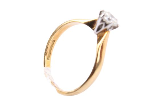An 18ct gold diamond solitaire ring. The round cut diamond of circa 0.3-0.4ct estimated weight, hallmarked, size P, gross weight 3.1g.