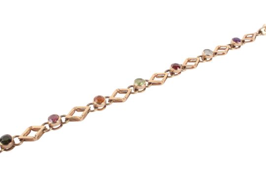 A 9ct gold stone set bracelet. Set with ten round cut coloured stones including amethyst, garnet, etc, each circa 3.5mm diameter, gold hallmarked, L19cm, gross weight 6.5g.