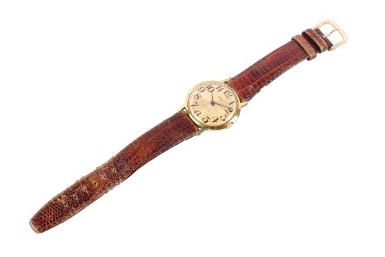 A gentleman's vintage Smiths wristwatch. The gilt face having Arabic numerals, in a gold plated case with a brown leather strap, dial Diameter 3.5cm