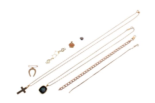 A small group of 9ct gold and yellow metal jewellery. Including a thin snake chain bracelet, curb link bracelet, enamelled crown charm, these hallmarked and weighing 9.3g, together with a pair of treble cleff earrings, illegible marks, two gold plated chains, a cross pendant marked 750 (test inconclusive) and a further pendant. Total gross weight 19.9g.