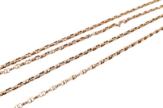 A long yellow metal chain necklace. The chain and accompanying watch chain clasp marked '9c', chain L71cm, gross weight 17.3g.