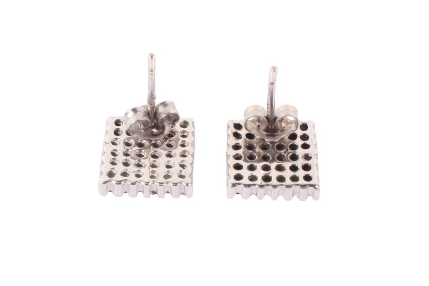 A pair of 18ct blue and white stone square earrings. With 16 small blue stones to the centre, total 1cm x 1cm, hallmarked, gross weight 4.7g.