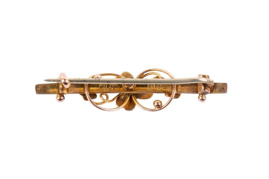 A tri-colour 9ct gold bar brooch. With flower decoration, hallmarked, white metal pin, L3.8ch, gross weight 1.8g.