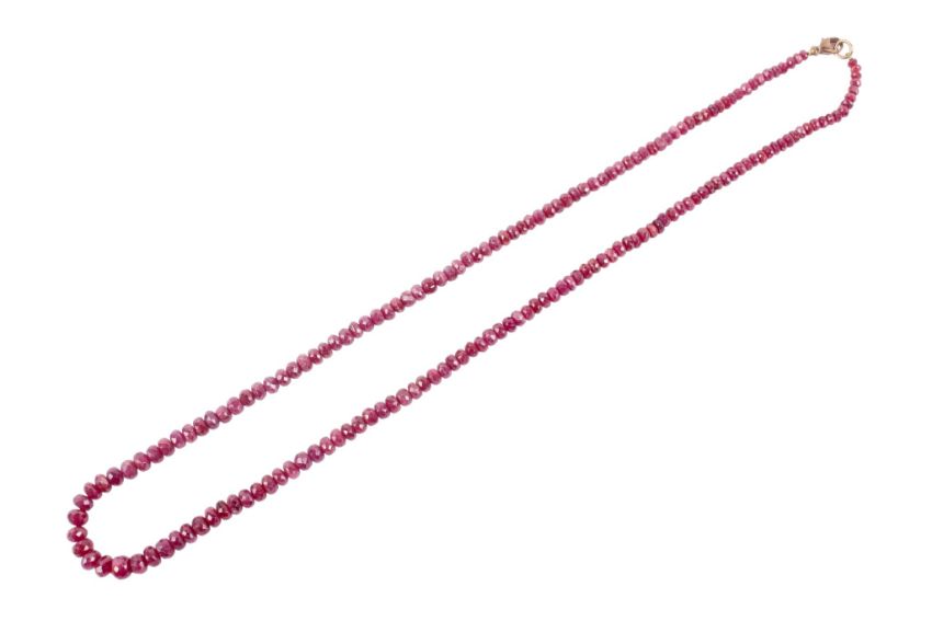 A necklet of faceted ruby beads. Overall length 450mm. The beads graduating in diameter from circa 2.7mm to 4.7mm. Gold plated fittings. Gross weight 16.5g.