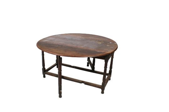 An 18th century oak drop leaf table. Having an oval top with drawers either side, raised on turned baluster supports united by a stretcher. H72cm x W128cm x D60cm (closed) each leaf 40cm