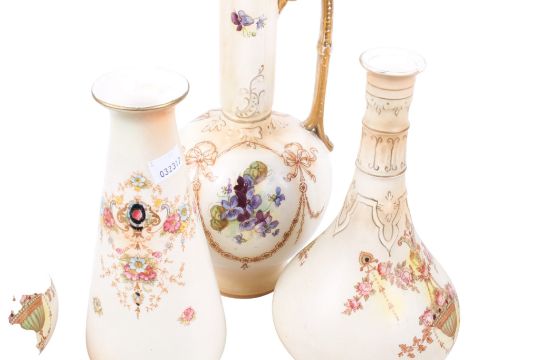 A collection of Victorian Crown Devon blush ivory ceramic items. Including a pair of vases, an ewer, etc. Max. H32cm