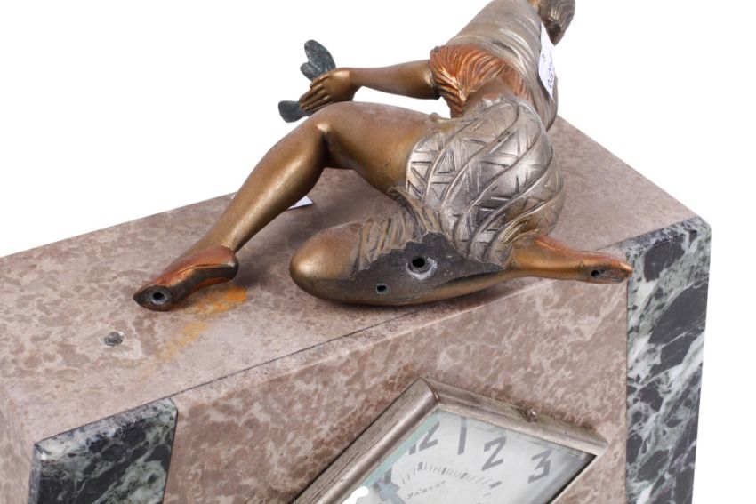 A marble Art Deco mantel clock. The black and beige mottled marble panels over a stoneware support, with Arabic numerals to the rhombus shaped face, topped with a figure of a lady with a bird, dimensions of clock H19 x W32.5cm x D10cm.