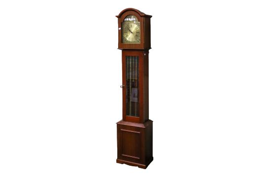 A contemporary Tempus Fugit longcase clock. The brass dial with Roman numerals and applied scrolls, the case having a glazed panel to the front, raised on bracket supports, with three weights and a pendulum, height 77cm.