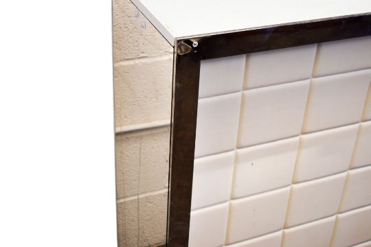 Late 20th century chrome and white padded vinyl drinks/cocktail bar. Having a glass top, H96cm x W110cm x D40cm