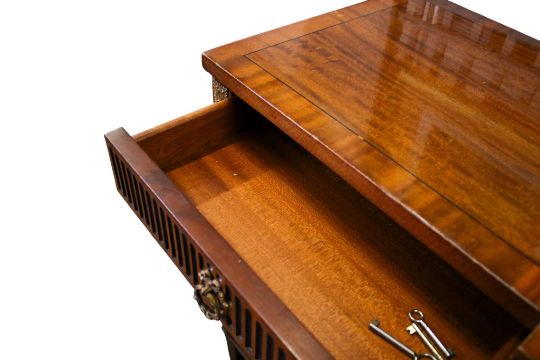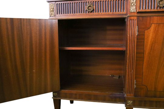 A 20th century Waring and Gillow mahogany veneered sideboard. The three drawers all having textured details and gilt ring handles, positioned over cupboards, raised on tapered square supports with spade feet, H89cm x W190cm x D48cm.