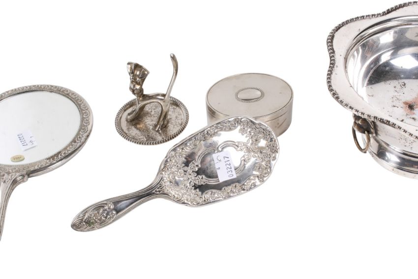 A group of five silver plated items. Including a hair brush and mirror, etc. Max. H10cm
